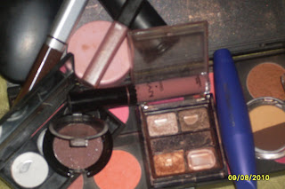 As you know, I used a peach-toned C.S blush, to lift my face and add in colour. In the picture it is shown between 3 different eye-shadows. I also used the warmer bronzer blush as a highlight and to contour. It is shown directly to the upper-right of the Cover Girl Lash Fusion Mascara in blue.