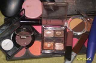 As you know, I used a peach-toned C.S blush, to lift my face and add in colour. In the picture it is shown between 3 different eye-shadows. I also used the warmer bronzer blush as a highlight and to contour. It is shown directly to the upper-right of the Cover Girl Lash Fusion Mascara in blue.